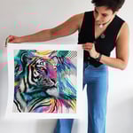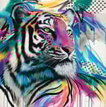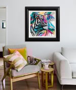 'Spirit' is a bold and beautiful big cat in an unconventional colour palette with fun graphic contrasts. ‘Spirit’ combines many elements from my signature style with bold swathes of colour and paint drips alongside delicate details. As ever my focus is on those beautiful eyes.