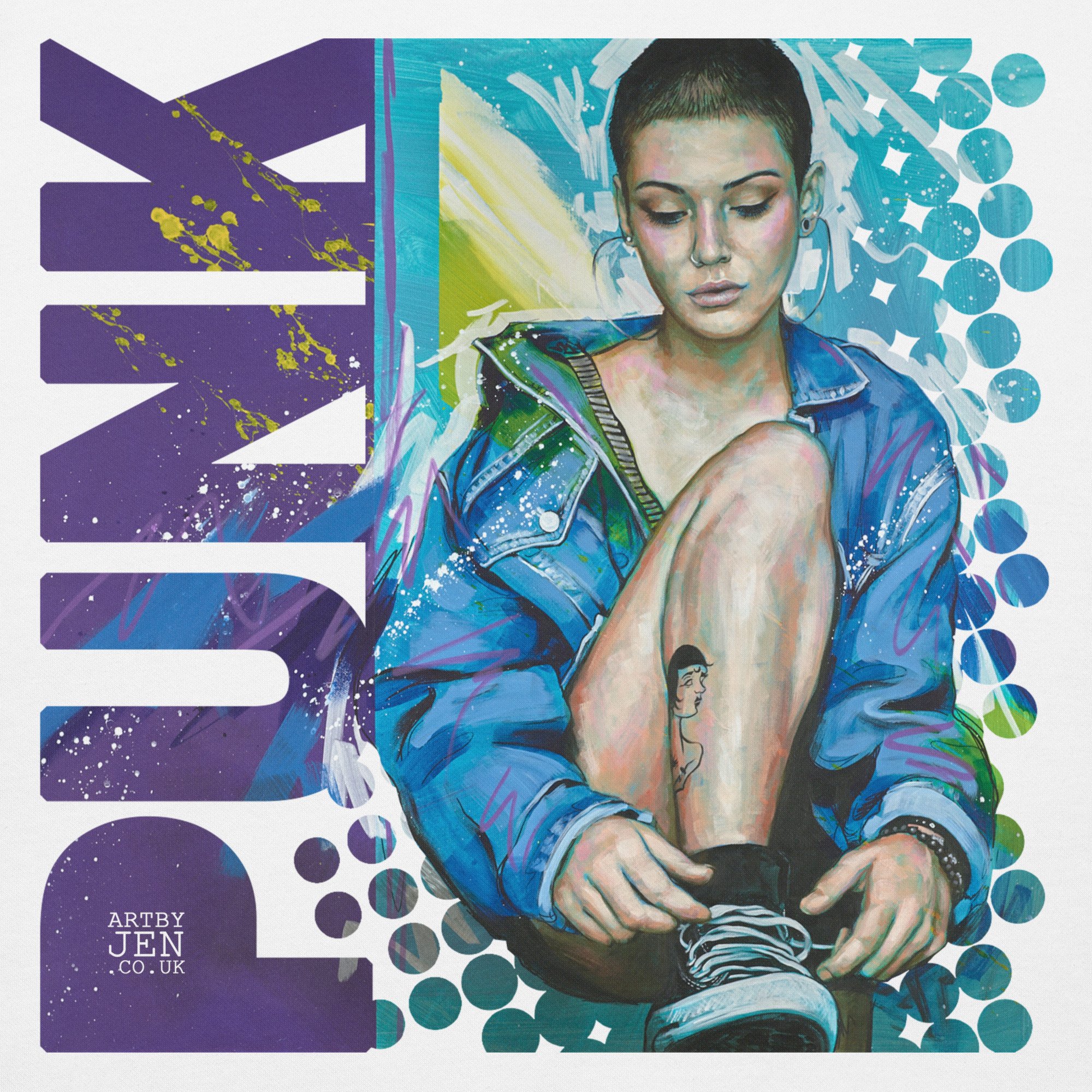 Embrace rebellion and individuality with the PUNK Attitude Hoodie by Art by Jen! Featuring my bold, badass painting His Jacket (SOLD), this hoodie is designed for those who live by their own rules. Whether you're hitting the streets, rocking out at a gig, or just staying cozy, this piece brings art and edge to your everyday style.